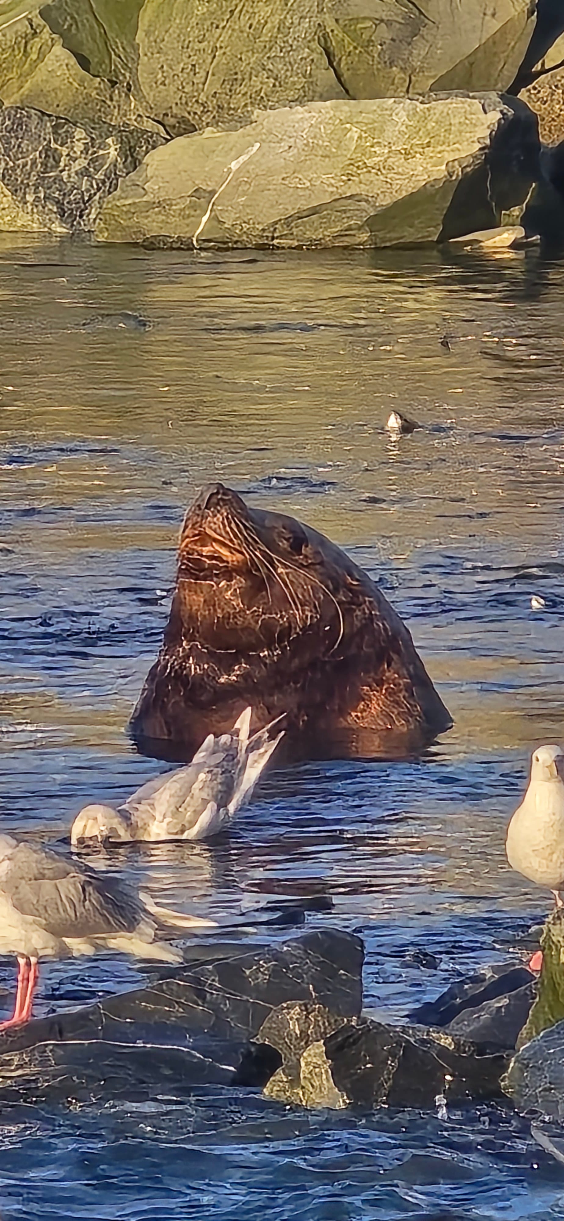 Harbor seals patrol the shallows, darting between the rocks to snatch salmon from the swarms. Sea lions, sometimes weighing over a thousand pounds, roll and dive through the schools with incredible power. Out beyond the point, you might even spot a humpback whale surfacing, drawn to the abundance of food in the bay.